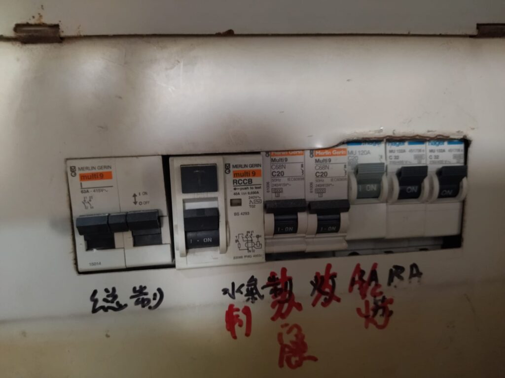 If the power supply in the MK rooftop laundry room disconnects, simply reset it by pushing the switch back to the correct position in the fuse box. The fuse box is located on-site, as shown in the image provided. Please make a note of this for future reference.